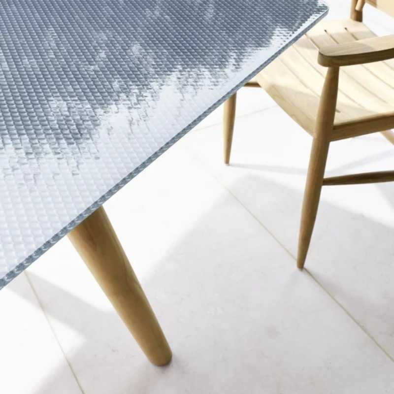 Die Tischplatten bestehen aus verschmolzenem Glas mit strukturierter Textur. Nach dem Abkühlen wird die Platte an der Rückseite lackiert, um ihr mehr Farbe und Glanz zu geben.
