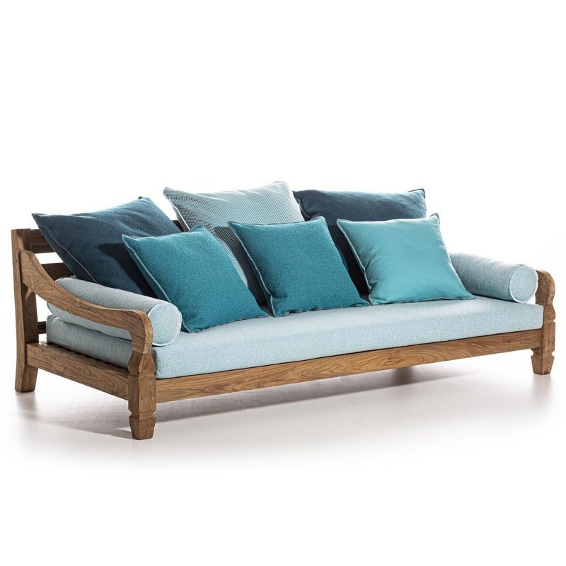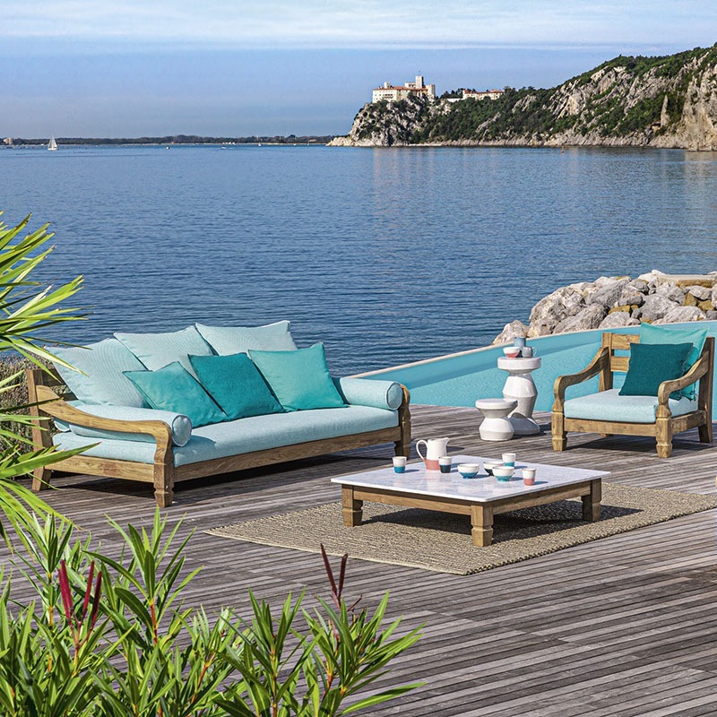 ECO-Teak geht auf wiederverwendete Balken aus Teakholz zurück, die vom genehmigten Abriss von traditionellen Holzhäusern der indonesischen Insel Java gewonnen werden. Die Elemente werden zugeschnitten, mit recyceltem Holz ausgebessert, zusammengesetzt und geschliffen, um die ursprüngliche Maserung zu unterstreichen. Das abschließende Finish basiert auf einer von Hand ausgeführten Politur mit Hanftüchern und Spänen.