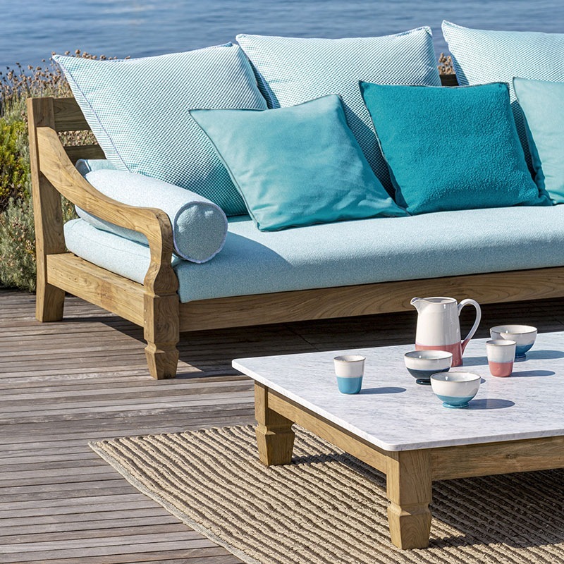 ECO-Teak geht auf wiederverwendete Balken aus Teakholz zurück, die vom genehmigten Abriss von traditionellen Holzhäusern der indonesischen Insel Java gewonnen werden. Die Elemente werden zugeschnitten, mit recyceltem Holz ausgebessert, zusammengesetzt und geschliffen, um die ursprüngliche Maserung zu unterstreichen. Das abschließende Finish basiert auf einer von Hand ausgeführten Politur mit Hanftüchern und Spänen.