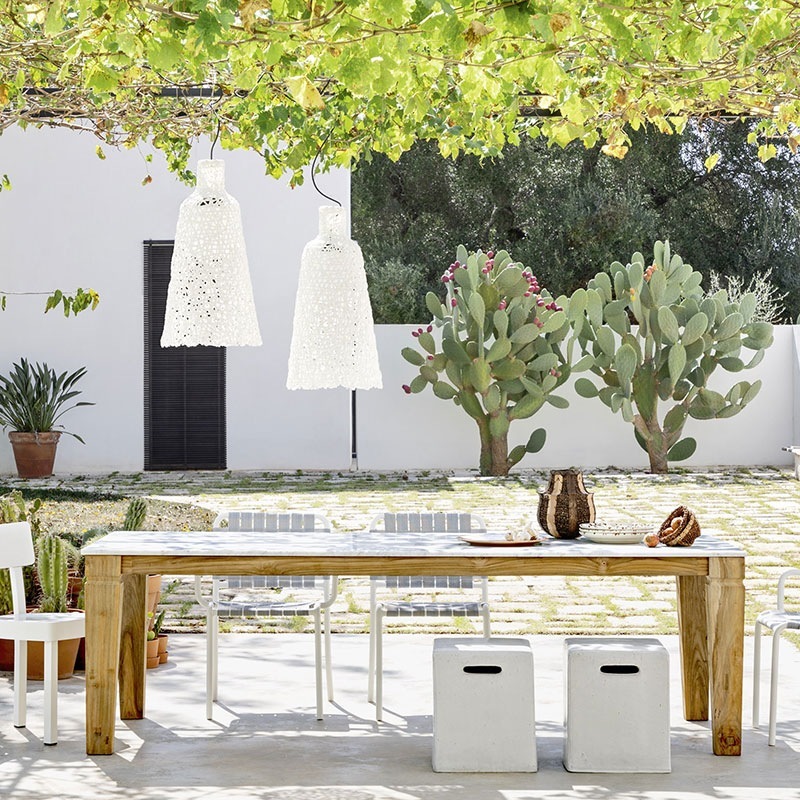 ECO-Teak geht auf wiederverwendete Balken aus Teakholz zurück, die vom genehmigten Abriss von traditionellen Holzhäusern der indonesischen Insel Java gewonnen werden. Die Elemente werden zugeschnitten, mit recyceltem Holz ausgebessert, zusammengesetzt und geschliffen, um die ursprüngliche Maserung zu unterstreichen. Das abschließende Finish basiert auf einer von Hand ausgeführten Politur mit Hanftüchern und Spänen.