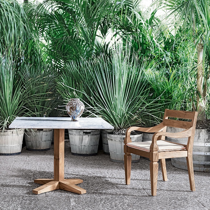 ECO-Teak geht auf wiederverwendete Balken aus Teakholz zurück, die vom genehmigten Abriss von traditionellen Holzhäusern der indonesischen Insel Java gewonnen werden. Die Elemente werden zugeschnitten, mit recyceltem Holz ausgebessert, zusammengesetzt und geschliffen, um die ursprüngliche Maserung zu unterstreichen. Das abschließende Finish basiert auf einer von Hand ausgeführten Politur mit Hanftüchern und Spänen.