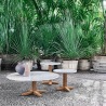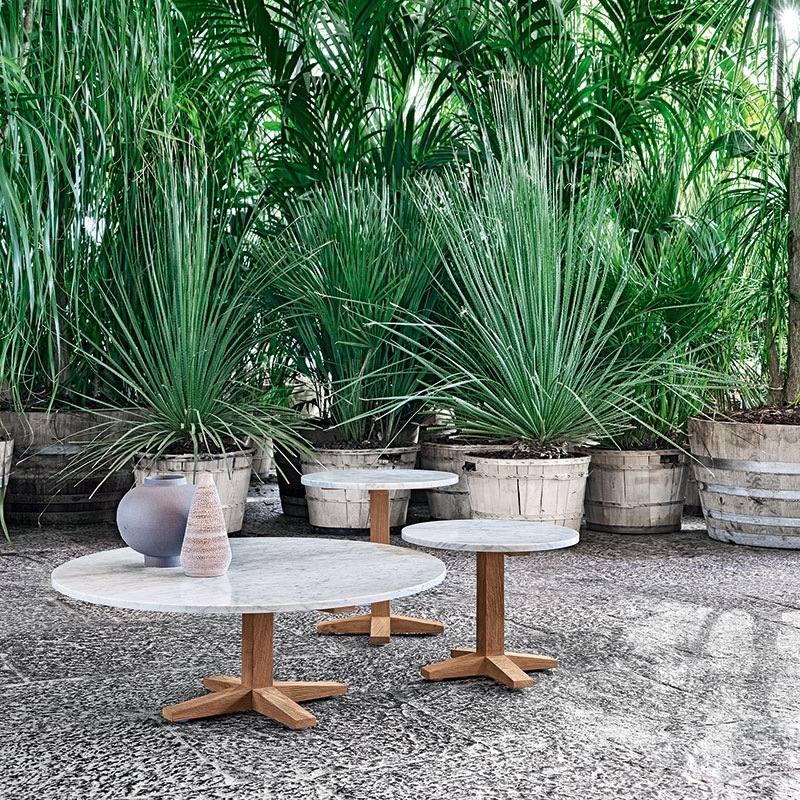 ECO-Teak geht auf wiederverwendete Balken aus Teakholz zurück, die vom genehmigten Abriss von traditionellen Holzhäusern der indonesischen Insel Java gewonnen werden. Die Elemente werden zugeschnitten, mit recyceltem Holz ausgebessert, zusammengesetzt und geschliffen, um die ursprüngliche Maserung zu unterstreichen. Das abschließende Finish basiert auf einer von Hand ausgeführten Politur mit Hanftüchern und Spänen.